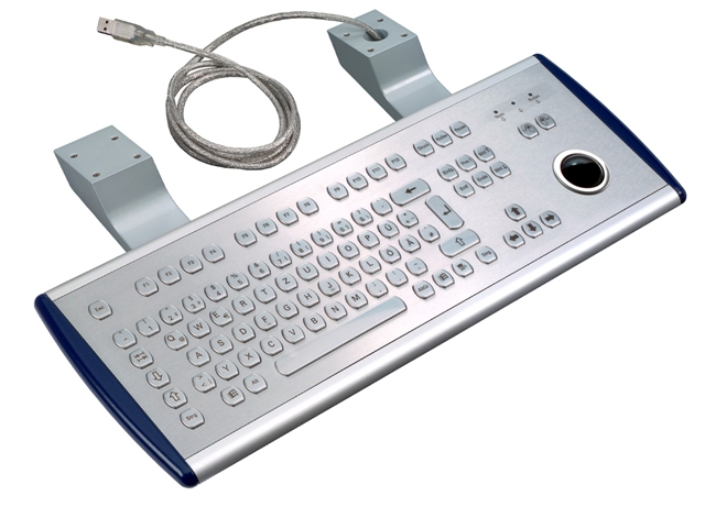 Vandalismusgeschützte Edelstahltastatur mit integriertem 38 mm Kunststofftrackball im Metallgehäuse vorbereitet für Pultmontage