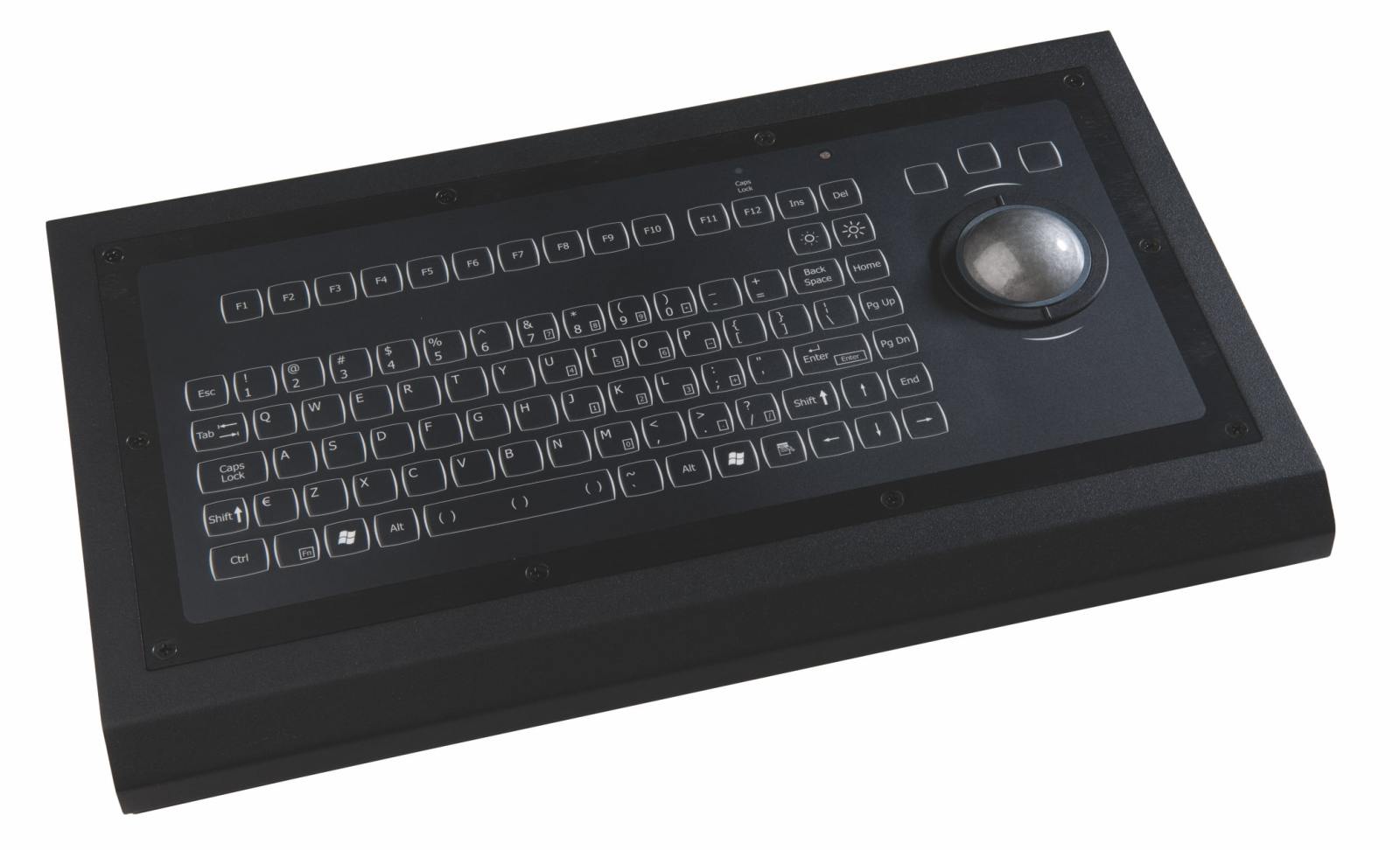 Kompakte Folientastatur mit Hintergrundbeleuchtung und 50 mm Kunststofftrackball im Metallgehäuse